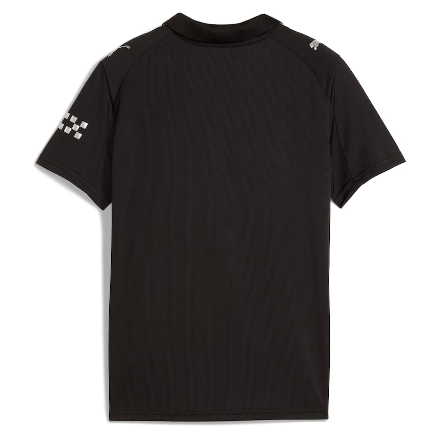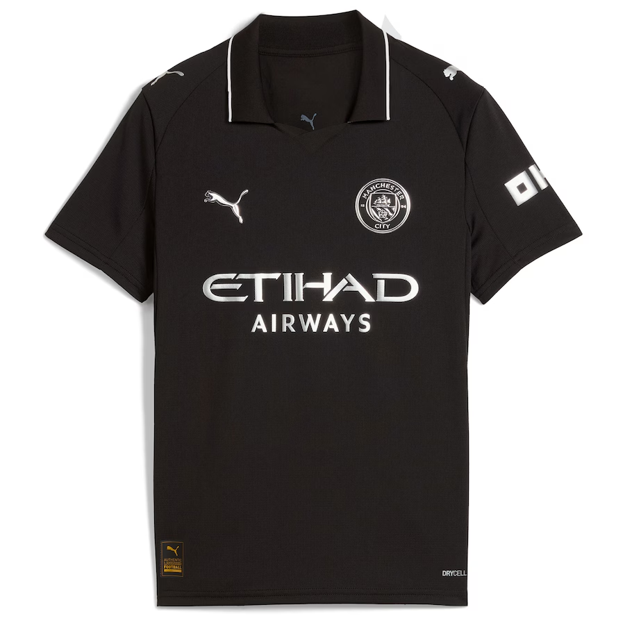 The 2025/26 away jersey reflects Manchester City’s origins, inspired by the club’s earliest-known kit from 1884 when they were based in Gorton. This all‑black look is elevated by metallic details, marrying historic design with contemporary aesthetics.